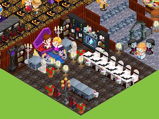 The upper tier is mostly devoted to a colourful and vibrant Halloween party, where Gran-Gran's Tables are in close proximity to the rather tasty Halloween Desserts display. Purple and orange are certainly the main colours in play, giving a slightly magical feel coupled with something more sinister. The flooring is mostly Theater Carpet but there's the clever inclusion of a selection of Happy Halloween faces to ensure that the diners don't get too comfortable.